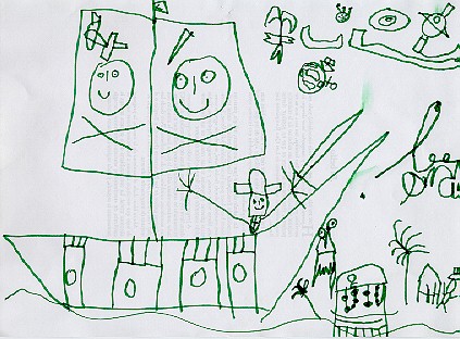 Bruno Ari nacido el 10 de octubre de 1992 barco pirata; a la derecha isla con palmeras y arriba, por alguna razón, un platillo volante (marzo 1997)
