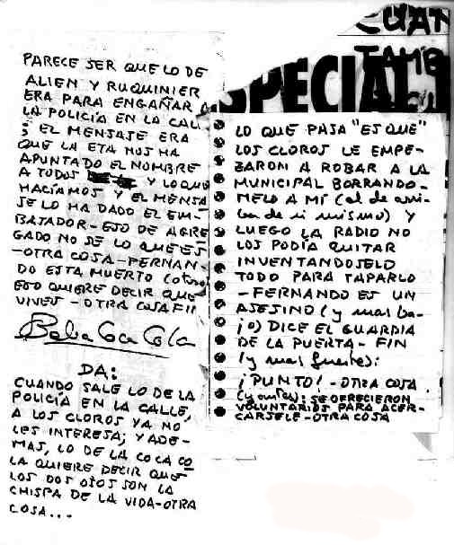 Una vez más, bordearemos lo indecible. Localicé el primero de estos carteles a finales de 1995 y el último ¾por el momento¾ a mediados de 1997, repartidos en un radio de pocos centenares de metros (como se comprueba en el plano), pegadas a farolas y escaparates de tiendas abandonadas, con saña tal que su despegado costaba un gran esfuerzo. Muchos más vi que no me fue dado recolectar, o que destrocé en el intento de hacerlo, y de las que no conservo noticia, bien porque las prisas del momento me impidieran su transcripción, bien porque se habían desvanecido bajo la lluvia (o tal vez arrebatadas por un rival madrugador) cuando volvía para recogerlas armado de un instrumento mejor que mi fiel cutter de bolsillo... El ejemplar que abre esta crónica estaba fotocopiado, pero mi colección tiene también alguna obra autógrafa, siempre sorprendentes, siempre nerviosas. La codicia de comunicación de su autor le hacía a veces superponer mensaje sobre mensaje fotocopiado, y en ocasiones apostillar en manuscrito sobre la superficie (como en el palmipsesto de C), o añadir algún signo encima (como en A). En el aislado mundo de las producciones de farola, constituyó una agradable variación el diálogo intermitente que establecí a lo largo de los meses y de los años con su desconocido autor, mi vecino. Sí: por aquel entonces yo vivía en Santa Cruz de Marcenado, y nunca dudé de que el eficaz pegador de carteles habitara por las inmediaciones. Cuando salía a pasear a la caída de la tarde, no podía sino imaginármelo también descendiendo de su hogar, con el bolsillo lleno de tiras escritas, y el bote de la eficaz cola oculto en una bolsa... A propósito: no cabe imaginar mejor formato para los mensajes callejeros que estas tiras, que o bien se superponían en vertical para cubrir el fuste de una farola, o bien se sumaban lateralmente para hacer un cartel. Para mí, su autor pronto recibió el título de "Otra Cosa". No importa cuál fuera la sorprendente historia que contara, la interrumpía con el escueto comentario "Otra cosa", para acto seguido reiniciar el relato. ¿El relato de qué? Pero ese es otro problema. Por los escritos de mi desconocido circulaba mucho el Ser Supremo, la KGB, "los de los modem" (quienquiera que fuesen), la ETA, el embajador, el agregado también (aunque "eso de agregado no sé lo que es"), Alien, la policía, bastante nombre propio (Fernando, Moll, Lucy)... y, claro, los "cloros". Sabemos de otros casos en que estos comunicadores de esquina convocan a los poderosos de la tierra... Rondan muertes, asesinos, por estas tiras escritas, aunque el tono no es trágico, sino contenido. "Fernando está muerto (otro)". Es el tono del explorador polar reflejando en su diario, que tal vez nadie leerá, acontecimientos terribles sobre los que nada puede hacer, y de los que ya ha visto demasiados...Sin duda quien las escribió sabe cosas que el resto de nosotros ignoramos. Los textos son difícilmente clasificables, pues: no constituyen denuncias, sino narraciones de hechos tanto más extraños cuanto que, a pesar de que los referentes son conocidos, nunca acabamos de saber qué pasa. Claro que las cosas no son sencillas: ¿por qué el autor aclara después de "mí", "(el de arriba de mí mismo)"? ¿Qué extraña jerarquía de yos tiene este personaje? Asistimos sin duda a una construcción ciclópea que abarca un gran conjunto de elementos del mundo contemporáneo. Sin embargo, y parece que cautamente, el autor se suele agazapar bajo opiniones ajenas: "Parece ser", comienza nuestro ejemplar; "Dice el de Arriba", se inicia el D; "Cuando dicen el [ilegible]" y "Dicen etc. etc.", son los comienzos de dos de las piezas del complejo palimpsesto de C. La conciencia lingüística de nuestro autor es notable, así como su dominio estilístico. Sabedor de que las cosas no son tan simples, puede poner los pelos de punta al lector con este entrecomillado brutal: "lo que pasa 'es que' los cloros". O ese final de cláusula reforzado (como esas obras musicales barrocas, que no acaban de acabar): "FIN (y más fuerte): ¡PUNTO! ¾ OTRA COSA". Cierto humor (por así decirlo) refleja el interludio "Beba Coca Cola" (¡hasta con la cursiva de imagen de marca!). Pero pronto nos encontraremos la explicación, de nuevo extrañamente amenazadora: "Además, lo de la Coca Cola quiere decir que los dos ojos son la chispa de la vida ¾Otra cosa"... El mundo de lo no dicho, de lo aludido o insinuado, puebla estas tiras. Obsérvese la abundancia de "lo", ese pronombre neutro, que agota en su referencia roma la sustancia sémica de las inmediaciones: "lo de Alien y Ruquinier", "lo de la policía en la calle", "inventándoselo todo para taparlo"; y los impersonales: "se ofrecieron voluntarios para acercársele". Puf. Demasiado... Y los cloros, ¿quiénes son los cloros? Seres tornadizos: "a los cloros ya no les interesa", audaces : "los cloros le empezaron a robar a la municipal". Y poco más. Bueno: otra cosa...
