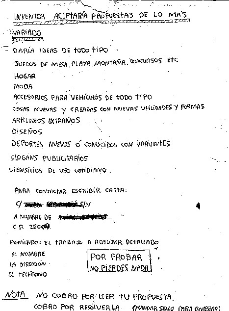 explicativa... Menos mal que ésta existe: la figura del inventor pertenece, por su propia naturaleza, al campo de lo no-definido, comenzando por su existencia misma: más bien producto de la cultura popular: cómic, cine... La palabra inventor nos remite, hoy, más a Eugenio Tarconi, al profesor Franz de Copenhague o al Profesor Chiflado que a Leonardo da Vinci. Nadie (pocos: a veces aparecen en los periódicos) se presenta a sí mismo, rotula su tarjeta, como "inventor". ¿Y cuáles son los productos propios de uno de estos profesionales? Insisto: cualquiera... siempre y cuando no exista ya. En una autoexplicación emboscada en el seno de la lista heteróclita podemos ver cómo resume su producción: "cosas nuevas" por una parte, y por otra: " [cosas] creadas con nuevas utilidades y formas". No se puede decir más, o menos, según se mire. Aunque debemos reconocer que la producción por antonomasia de estos personajes es más bien la máquina mecánica y opaca (el artilugio) o, en estos tiempos, el ingenio digital y portentoso. Nuestro Inventor, sin embargo, demuestra una flexibilidad mayor, prácticamente sin límites: su campo de creación son tanto los intangibles ("ideas de todo tipo", "juegos", "slogans", incluso "diseños", en una irrupción de modernidad), como los mecanismos ("artilujios [sic, por su única falta de ortografía] extraños", "utensilios")... Si cualquier clasificación nos permite un atisbo privilegiado del mundo mental del sujeto categorizador, en este caso nos movemos desdichadamente por un espacio romo, configurado como las secciones de una revista ("juegos", "hogar", "moda", automóviles, deportes...). Ahora bien: ¿son estos realmente campos para la invención? O es una forma de señalar la universalidad de su cometido, como si dijera: "De cuanto hay, de eso puedo ocuparme". El hecho de la improbabilidad manifiesta de la mayoría de las posibilidades no parece arredrarle: ¿quién estará por la labor de encargar a un inventor la creación de deportes "conocidos con variantes", o de un nuevo juego de playa? Demos algún paso más, en esta función de detectives de farola: nuestro Inventor no carece de cultura: ortografía casi perfecta, buena grafía de extranjerismos. Escribe en mayúsculas, lo que quizás sea un recurso para huir de una caligrafía detestable. Tiene bien asimilados ¾lo hemos visto desde el principio¾ los modos del género publicitario, y de ahí sus lemas: "por probar no pierdes nada", "No cobro por leer tu propuesta, cobro por resolverla". Al fin y al cabo, la invención de slogans es una de sus habilidades... Obsérvese también el tuteo al lector, muestra de intención de acercamiento. El léxico ofrece cierta elaboración, siempe en el mismo registro: "contactar", "utensilios", e incluso el galicismo "trabajo a realizar". Por si el mismo vehículo utilizado no fuera suficiente para hablarnos de su estado de precariedad, obsérvese quizás el hecho de manuscribir el texto (¿a falta de otros procedimientos?), y sobre todo el ¾bastante patético¾ "mandar sello para contestar". Nuestro hombre ¾parece evidente¾ quiere encargos, quiere trabajo, tal vez incluso cualquier tipo de trabajo (y aquí lo universal de su campo de acción tiene que ver directamente con lo omnívoro de sus necesidades, o son ambos la misma cosa). Pero no quiere problemas, y por eso a "Para contactar, escribir carta" añade "Poniendo: el trabajo a realizar, detallado". Y ahí, en esa puntillosa petición de zonas de referencia en quien se ha presentado como poco menos que factótum universal, leo el miedo íntimo a enfrentarse con el primer encargo. |
