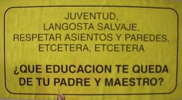 momento en suspenso... Tras una simple coma aparece: "respetar asientos y paredes". Es raro: así, tan a continuación. Podría ser una orden, en lenguaje vulgar ("respetar" por "respetad"), una admonición encaminada a corregir un mal comportamiento, por ejemplo, dada la elección de los objetos "asiento" y "pared", a que dejen de pintar, escribir o grabar sobre estos espacios (públicos). Continúa, tras coma, "etcétera etcétera". O sea: asientos y paredes como representantes canónicos de un amplio conjunto de objetos expuestos a la maldad de la juventud. Si esto fuera así, la que se aplicaría sería la acepción primera de "langosta". Curiosamente, el mismo Diccionario académico vendrá en nuestra ayuda. En la tercera acepción del término indica: "fig. y fam. Lo que destruye o consume una cosa. Los muchachos son LANGOSTA de las despensas". ¡Ajá! Los académicos ya lo habían notado: el comportamiento de los jovenes es tan destructivo que su parangón con las langostas (no lo dicen, pero en su acepción 1, ortóptera) es algo tan natural, que hasta es el ejemplo aportado por el diccionario. Bien, bien... No se trata pues del crustáceo "de color fusco". Se trata de la langosta de la plaga bíblica. Los jóvenes son una plaga... |
