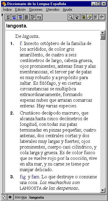 todo: obras enciclopédicas, seriales, gritos ¾y poemas. Este que nos ocupa entraría, a decir verdad, más bien en la categoría de haiku. Líneas breves, mención de un elemento de la naturaleza, suspensión del sentido final... ¿Qué tenemos exactamente entre manos? Dotados de las armas proporcionadas por varios siglos de crítica textual, trataremos de explorarlo. "Juventud": esta extraordinaria pieza comienza con lo que a todas luces es un vocativo, seguido de lo que parece un epíteto en aposición, "langosta salvaje". Y aquí nos asalta la segunda duda: la langosta, ¿será el "Insecto ortóptero de la familia de los acrídidos" o el "Crustáceo decápodo macruro" (siempre según la Academia). O sea, ¿el saltamontes o el apetitoso marisco? Nada nos dice el contexto, excepto por el "salvaje" acompañante. La Academia nos da en la acepción 2 de la palabra: "Dícese del animal que no es doméstico", pero ni saltamontes ni crustáceos son buenos candidatos para la domesticidad... |