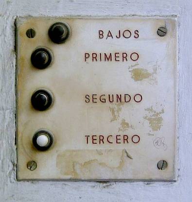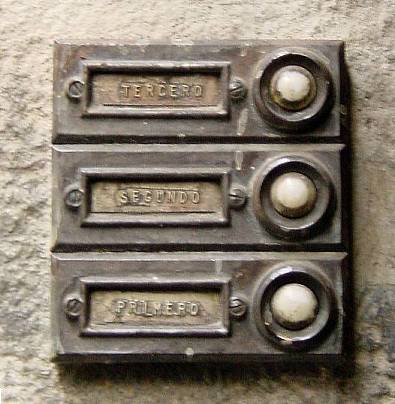 Figura 1: Barcelona, Raval, 2003 Los timbres son curiosas interfaces del exterior con el interior. En su diseño (popular, artesanal, industrial...) chocan dos concepciones: la espacial y la textual. Para la primera de ellas, el conjunto de los timbres reproduce a menor tamaño la estructura de la vivienda: el timbre superior es el del piso que está más arriba, y el inferior es el del que está más abajo (Figura 1). En las casas más complejas, además, en cada fila el timbre izquierdo representa al piso situado a la izquierda del rellano, el derecho el de la derecha, etc. Pero hay otra ordenación posible, la que dicta la lógica del texto. Una descripción lógica procede de abajo a arriba (no va a "empezar la casa por el tejado"), pero el texto, ay, en nuestra cultura, avanza de arriba a abajo. El resultado (Figura 2) transgrede el orden de la mímesis, pero se adhiere al más racional orden del texto... Además, y por increíble carambola de la lengua, los pisos de la Figura 2 están no sólo en orden lógico, sino incluso en orden alfabético. Su irreprochable catálogo tal vez no será tal vez la solución más extendida en el mundo del timbre, pero sí la más depurada.