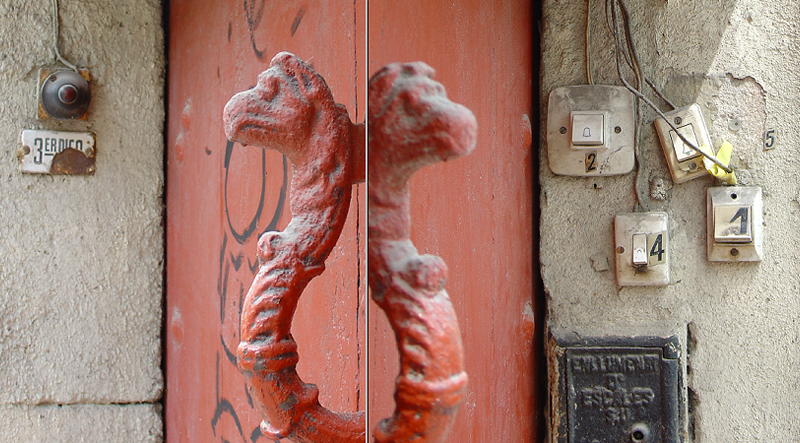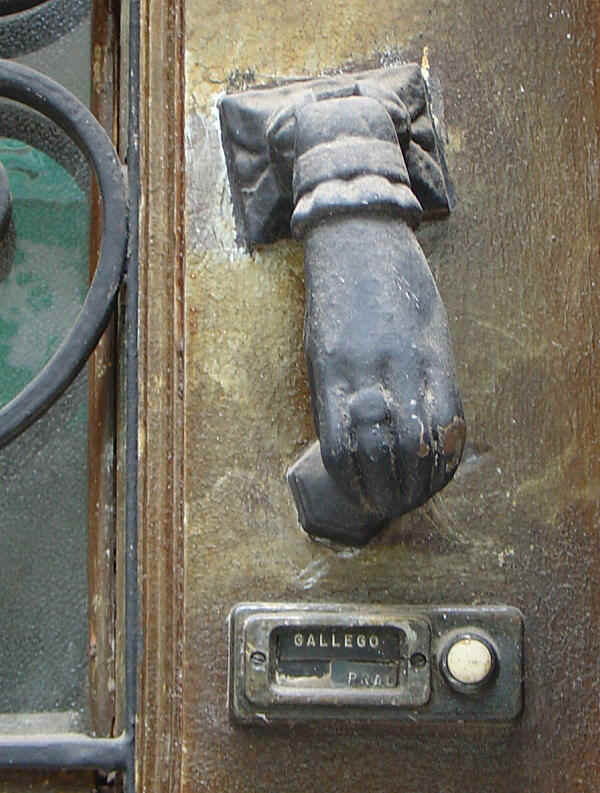 O los timbres apiñados a un lado y otro de la aldaba, bajo su mirada ausente....