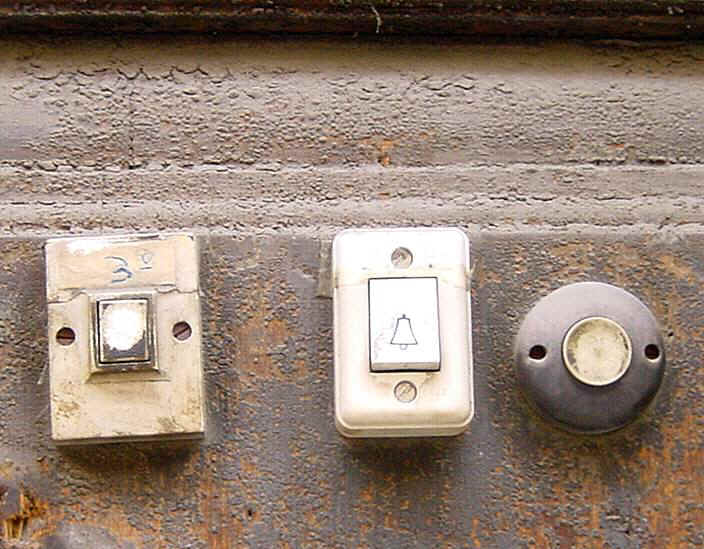 La mugre diferencial sirve como indicio de las muy distintas historias que hay tras cada timbre. Cualquier detective distinguiría en esta panoplia de llamadores la interesante historia del primero primera...