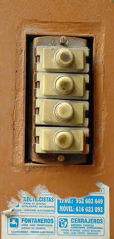 Los cerrajeros son los enemigos mortales de los timbres: representan la fuerza frente a la palabra, la violación frente al permiso. Por eso sus torpes pegatinas publicitarias se hacen presentes constantemente a su lado, recordando que allá donde falla el diálogo, su intervención podría ser necesaria. Y lo dicen de forma pegajosa y molesta, adhiriéndose a su misma superficie, revoloteando a su alrededor.